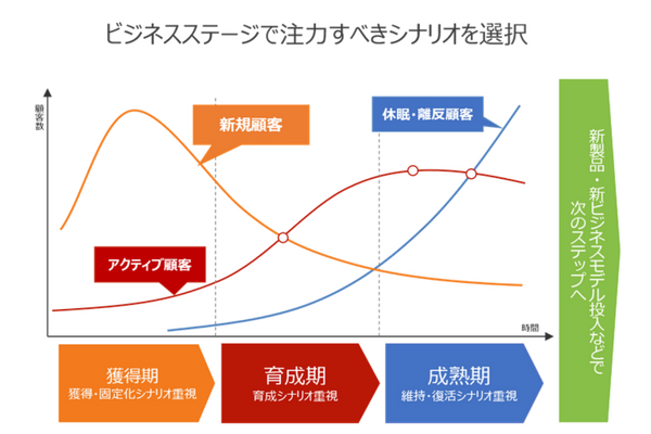 これらの顧客ライフサイクル軸での顧客の動きによって、シナリオの大方針が決定されます。