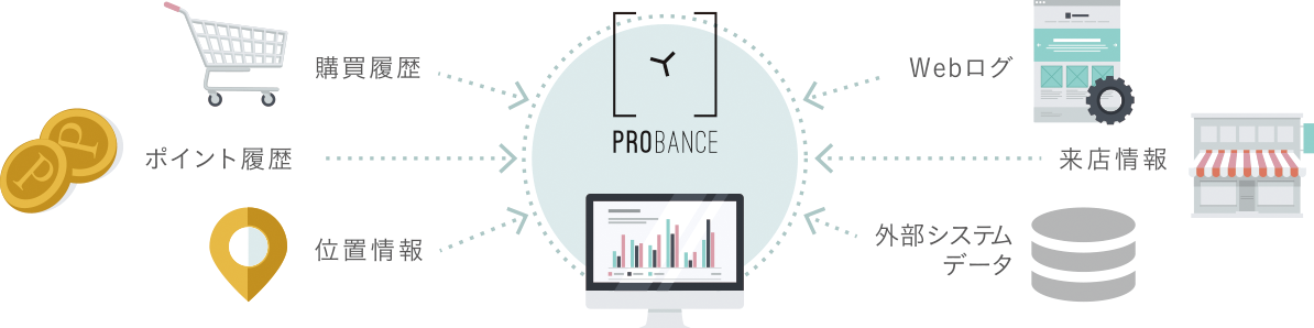 Probanceは顧客データ、購買履歴、クーポン利用履歴、ポイント履歴などの社内データの取得・統合に加えて、SAP Predictive AnalyticsやTableauなど外部システムとの連携も可能です。