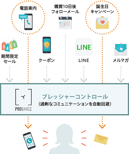 Probanceは同一顧客への過剰なコミュニケーションを回避する(あるいはプライオリティの高いメッセージを優先する)プレッシャーコントロール機能を搭載しています。