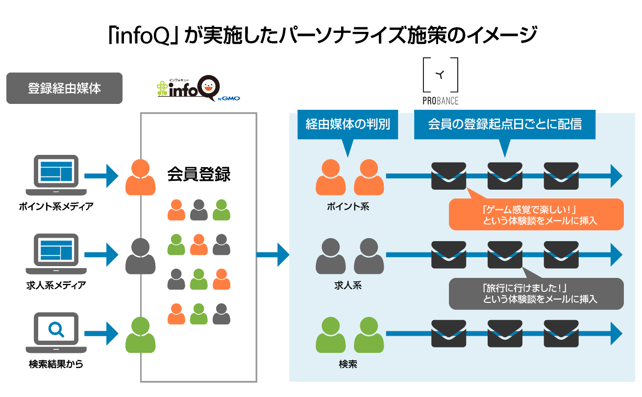 従来、「infoQ」の会員登録後に配信する利用促進メールは画一的なものでしたが、「Probance」導入後は、会員の登録経路別にパーソナライズした「ユーザーの声」を、ステップメールにて配信しました。